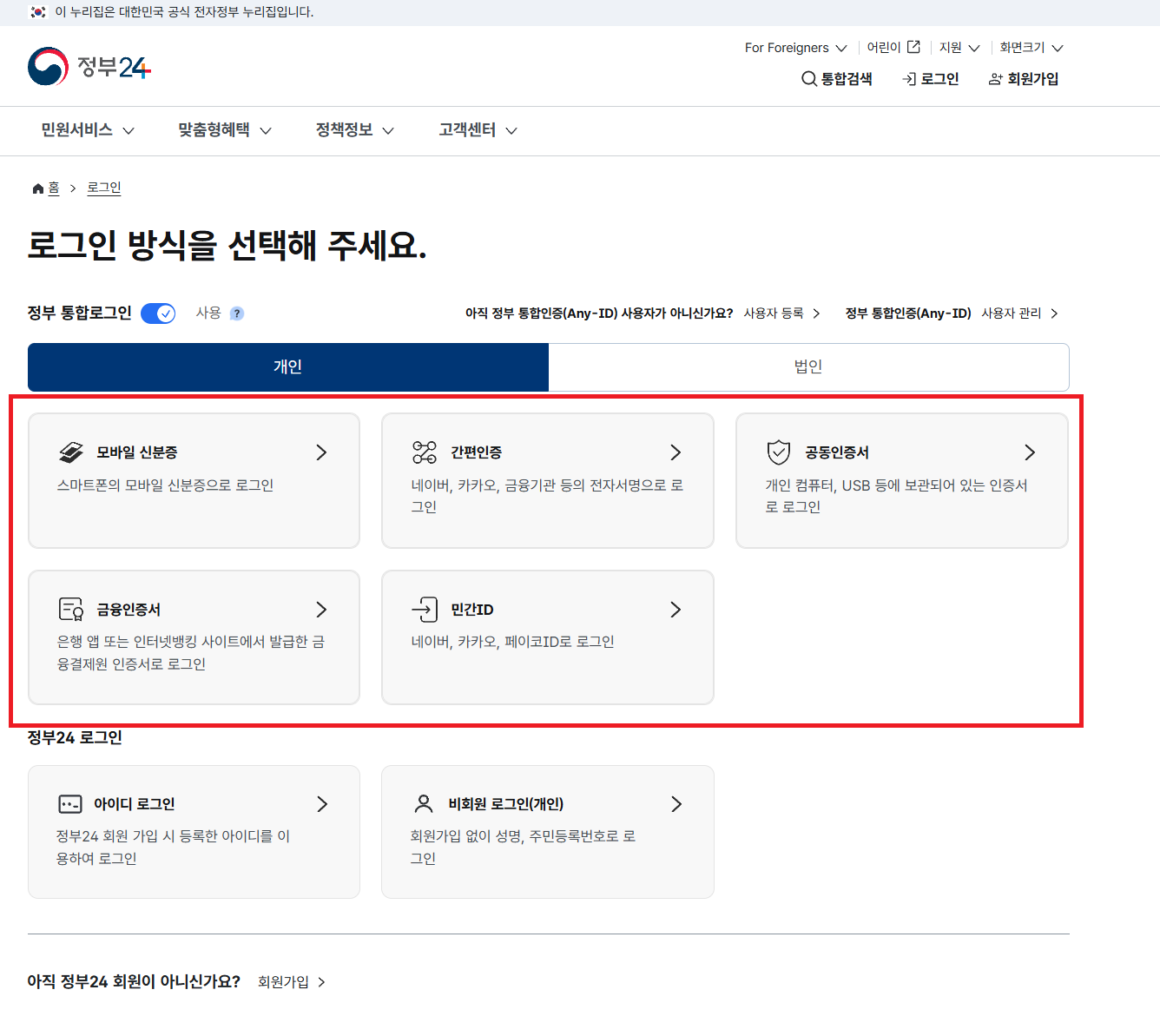 - 정부24에 로그인 (공동인증서, 금융인증서, 카카오/네이버 간편인증 가능)