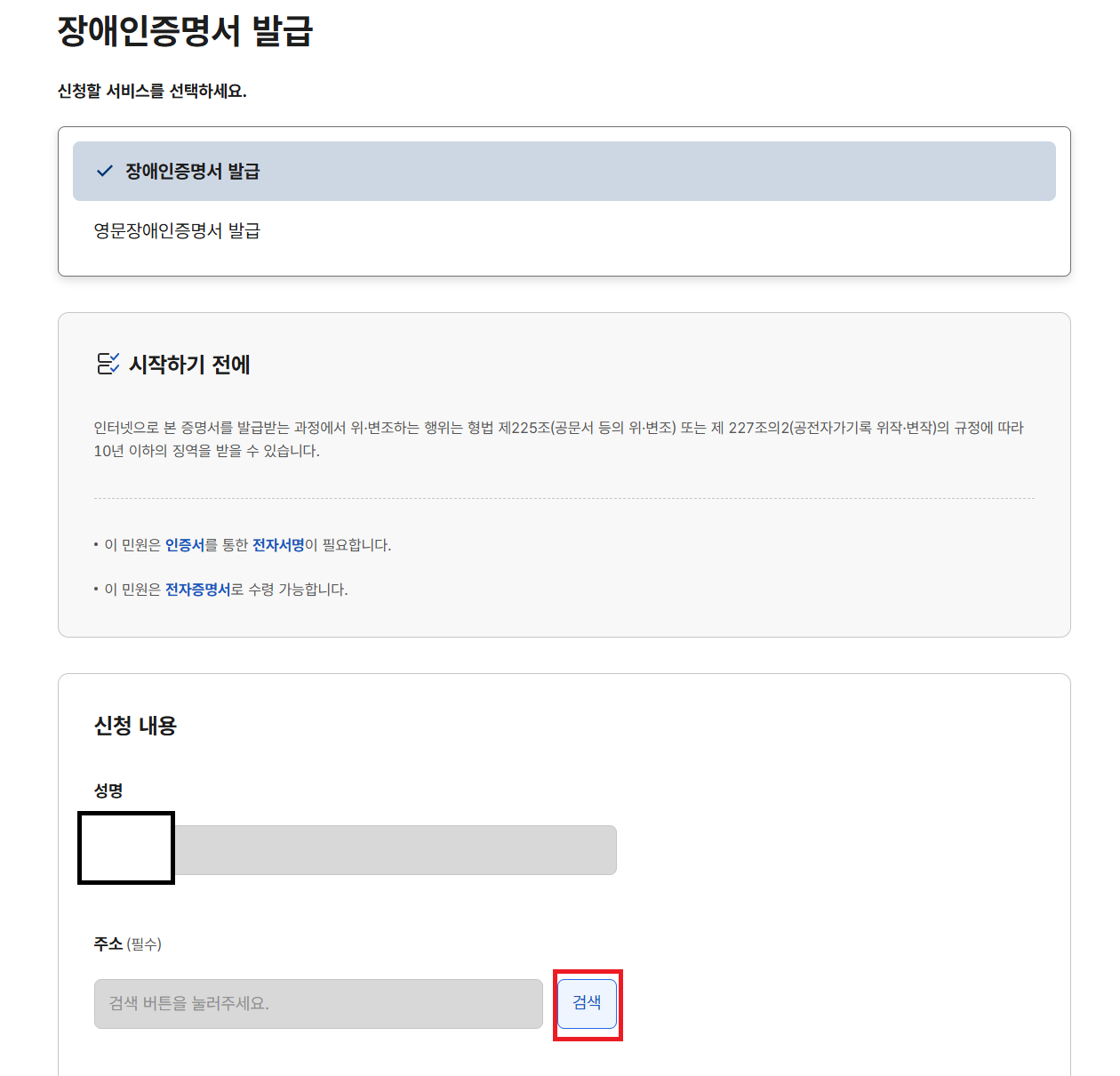 장애인증명서 발급을 누르시면 위와같은 화면이 나오는데 주소 옆 검색창을 눌러주세요!