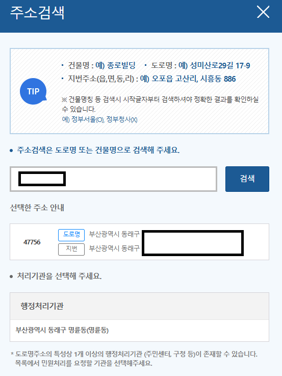 주소 검색을 누르신 후 주소검색은 반드시 본인의 주민등록등본상 주소를 검색하셔야 하고 그 지역의 행정처리 기관을 꼭 확인하시고 클릭하셔야 합니다.